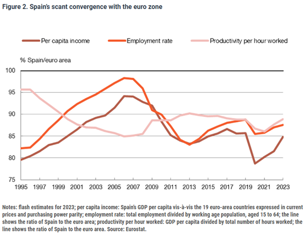 While the UK is richer than Spain, there are striking parallels in their economic trajectories. Spain's income per capita was converging toward EU levels before the 2009 financial crisis, but that process has since stalled and has not resumed.